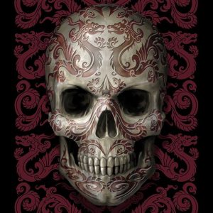 Adorned with small skulls, pentagrams and moons.
